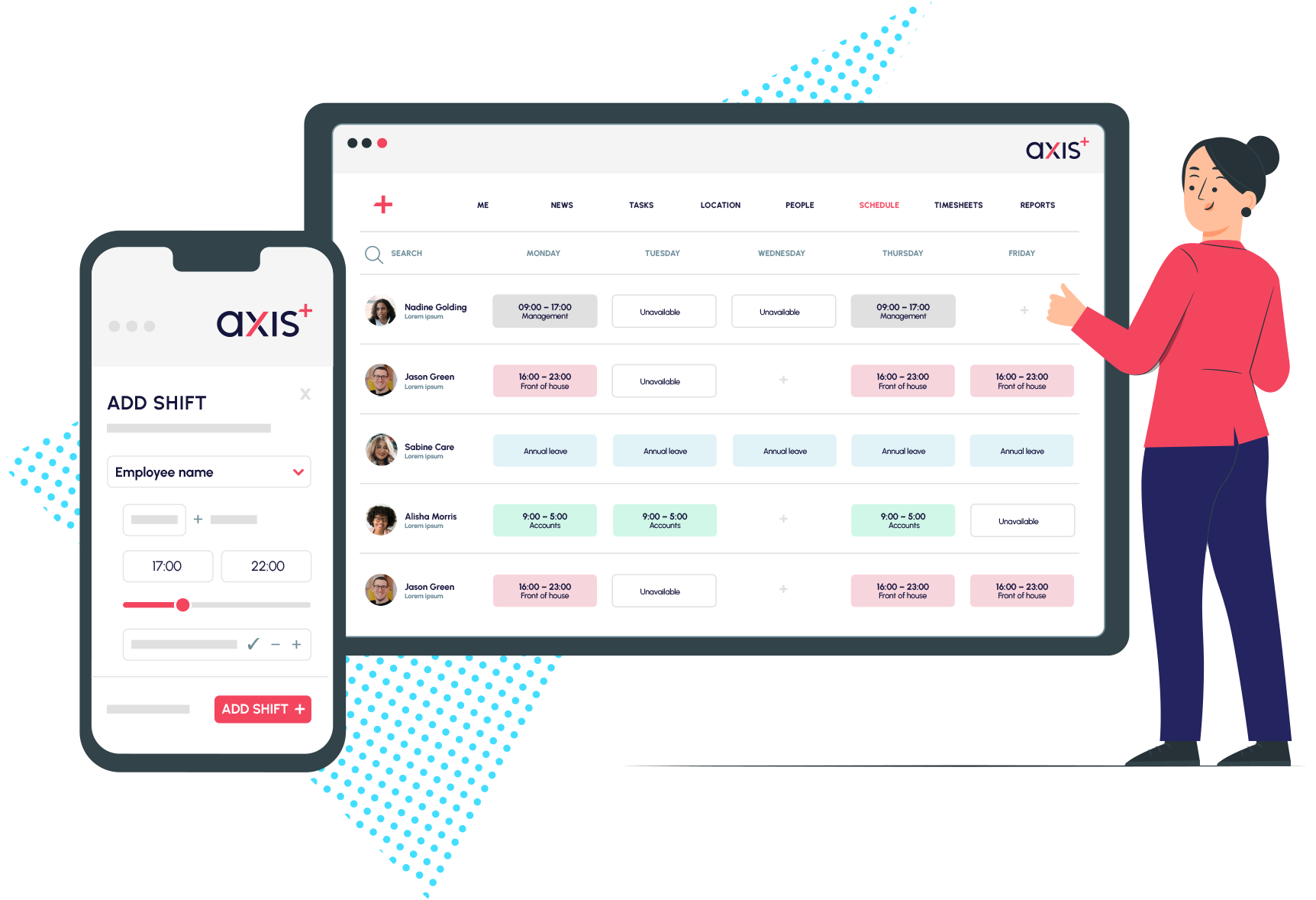 Axis Plus is an intuitive, end to end platform, making it easy to create rosters, schedule your teams, manage time and attendance and create accurate payroll reports. The platform is perfect for both large, national organisations and SMEs.